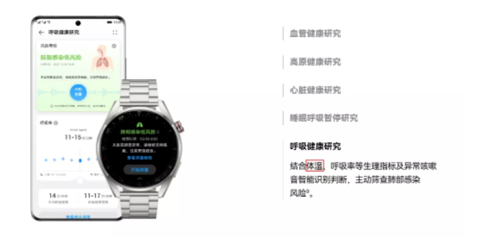 华为WATCH 3 Pro new还支持心率监测、体温测量、科学睡眠监测及血氧饱和度监测、高原血氧监测等功能,并加入心脏健康研究和睡眠呼吸暂停研究,以及呼吸健康研究,提供从身体健康数据监测到健康风险提醒健康管理生态,带来更加专业、丰富的健康守护。